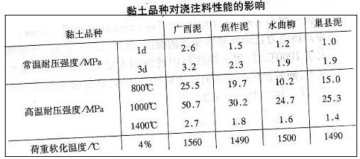 粘土結合劑是粘土耐火澆注料的主體材料之一,也是基質的重要組成部分。因此,粘土結合劑的品種和用量,對其性能有重要影響。結合黏土品種較多,就是一個地方的粘土,因礦點的不同,其性能也有所區別。多年的試驗與實踐證明,不是所有的結合粘土都能做粘土結合劑,只有廣西泥和永吉4號泥比較好,焦作泥次之,水曲柳等粘土也能勉強使用,但黏性大,需水量多,性能較差。見(下表一)為粘土品種對澆注料性能的影響。表標中看出,廣西泥作結合劑,配制得澆注料性能最好,焦作泥的次之,水曲柳和巢縣泥配制的澆注料,性能較差,一般不推薦使用。總之,粘土結合劑的選擇得當,就能配制成性能良好的耐火澆注料。