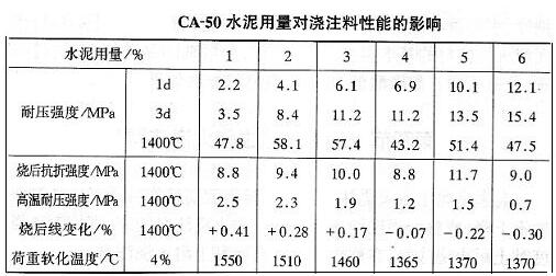 黏土耐火澆注料用的促凝劑,其品種和用量對性能的影響,對于常溫耐壓強度和1400℃高溫耐壓強度來說,CA-70水泥的作用效果 比CA-50水泥的好,但成本增加較大:隨著促凝劑用量的增加,3d常溫耐壓強度不斷提高,1400℃高溫耐壓強度則不斷下降。(下表二)為CA-50水泥用量對澆注料性能的影響。從表中看出,隨著CA-50水泥促凝劑的不斷增加,常溫耐壓強度提高,1400℃高溫耐壓強度和變形4%的荷重軟化溫度則不斷降低,1400℃燒后線變化由膨脹磚為收縮,1400℃燒后耐壓強度變化無規律。