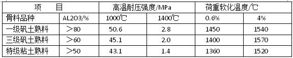 在黏土耐火澆注料中,耐火骨料起骨架作用,是其重要組成部分,占總料量的60%~70%。(下表三)為耐火骨料品種對澆注料性能的影響。表標中看出,耐火骨料品種依AL2O3含量為據,則隨AL2O3含量的增加,高溫耐壓強度提高,荷重軟化溫度開始點(變形0.6%)也提高,變形4%的荷重軟化溫度均大于1520℃,三級礬土熟料骨料略高些。因此,普通黏土耐火澆注料廣泛采用三級礬土熟料做耐火骨料,并取得了良好的使用效果。