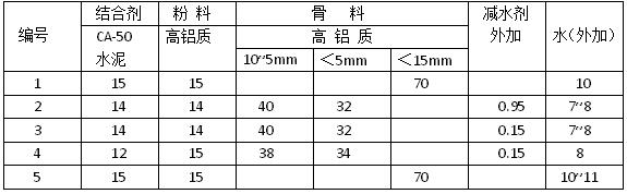 礬土水泥耐火澆注料是不定形耐火材料中的重要品種,常用配合比列于下表。表內編號1~3所用耐火骨料和粉料是用三級礬土熟料制備的,編號4為一級礬土熟料的,編號5為一級粘土熟料的。