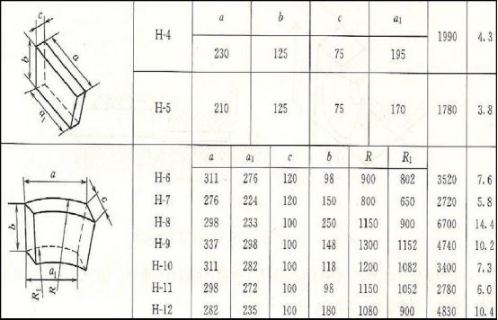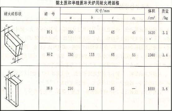 (1)耐火磚型號和規格,粘土質和半硅質沖天爐用耐火磚有H-1至H-12十二個型號,現中小型沖天爐多用H-1至H-3三種,H-4以上各型磚多供大型(8~10t/h)以上沖天爐使用。各種沖天爐用磚形狀尺寸見下表