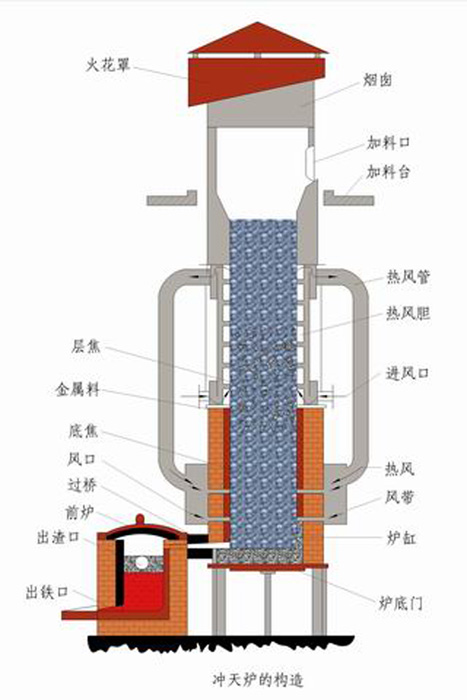 沖天爐,是鑄造生產中熔化鑄鐵的重要設備,將鑄鐵塊熔化成鐵水后澆注到砂型中待冷卻后開箱而得到鑄件。沖天爐是一種豎式圓筒形熔煉爐,分為前爐和后爐。前爐又分為出鐵口,出渣口,爐蓋前爐缸和過橋。后爐又分為三個部分,頂爐,腰爐和爐缸。腰爐與熱風圍管分開,修爐之后合上,用泥巴密封。頂爐上是熱交換器。主要用于鑄鐵件生產,也用以配合轉爐煉鋼,因爐頂開口向上,故稱沖天爐。