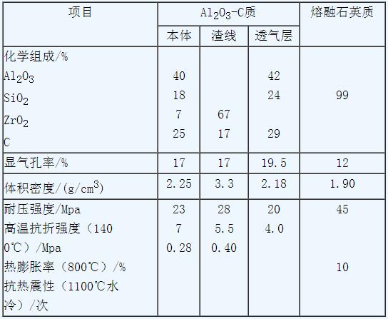 浸入式水口的材質常用的為熔融石英質及鋁碳質。熔融石英質水口由于耐侵蝕性較差,不適應多爐連鑄及連鑄鋼種擴大的要求,兩種浸入式水口的性能比較見表2。20世紀90年代以來采用鋁碳質、鋁碳-鋯碳質復合式水口,日本還開發了在鋁碳質材料的基礎上添加ACT,AZTS合成原料的浸入式水口和以ZrO2-C補強的復合式水口。