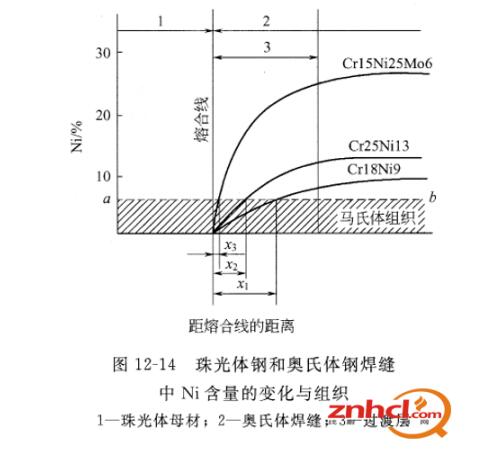 由圖12-14可知,珠光體和奧氏體界面處的Ni含量是逐漸變化的。由第六章中的Schaeffler耐熱鋼組織圖可知,Ni含量的降低可能產(chǎn)生馬氏體脆性層,導(dǎo)致熔合區(qū)的破壞。