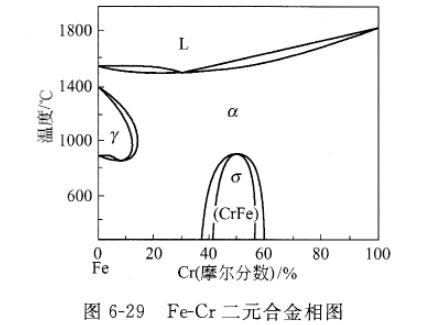 鉻是耐熱鋼的主要合金元素,對鋼的耐熱性起重要的作用。Fe-Cr二元合金相圖如圖6-29所示。