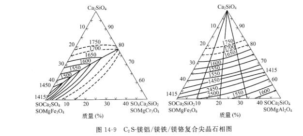 從圖 14-9 可知,C2S-MgO . (Fe, Cr)203 系統(tǒng)的熔點(diǎn)比 C2S-MgO • (Fe, AD2O3系統(tǒng)高200°C左右。由此推知,鎂鉻磚的耐燒蝕性要比鎂鋁尖晶石磚、 鎂鐵尖晶石磚、鐵鋁尖晶石磚好得多。