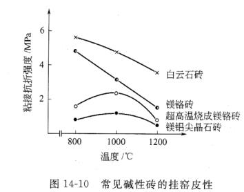 第三,水泥熟料與白云石磚的反應(yīng)產(chǎn)物是C3S,與鎂鉻、鎂鋁耐火材料的反應(yīng)產(chǎn)物都有C2S。C2S具有相變和粉化的可能。在Cr、AU Fe三種元素中.只 有Cr能穩(wěn)定/J-C2S。所以,白云石磚的掛窯皮性最好,鎂鉻磚次之,鎂鋁磚的掛窯皮性最差。水泥熟料-耐火材料界面的粘接抗折強(qiáng)度如圖14-10所示。
