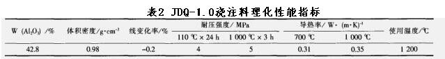 隔熱層用耐火澆注料要求體積密度小,導熱系數低,保溫性能好,考慮到隔熱層的使用溫度,在耐火材料的使用溫度允許條件下,盡可能選用體積密度低的澆注料,綜合考慮耐火材料的各種性能,選用了牌號為JDQ-1.0(鄭州駒達耐材)的輕質保溫澆注料,這種澆注料具有強度高,導熱率低、保溫性能好、燒后的永久線變化率收縮小、施工方便的優點。其具體理化性能指標見下表
