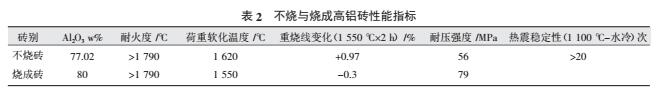 一般不燒制品采用多級顆粒配料,選用適當(dāng)?shù)挠袡C與無機結(jié)合劑、添加劑,其制品的體積密度、氣孔率、抗侵蝕性和抗?jié)B透性等普遍好于燒成制品。特別是不燒磚借助使用環(huán)境中的熱能達到適當(dāng)燒結(jié),形成具有梯度特征的結(jié)構(gòu),以及主體材料與添加物熱膨脹系數(shù)不一致的特性,是不燒磚在使用條件下產(chǎn)生足夠多的微細裂紋,且裂紋以準靜態(tài)方式擴展,從而提高不燒磚的抗熱震穩(wěn)定性,(表2)是不燒高荷軟高鋁磚與長期使用的燒成高鋁磚性能對比。不燒磚的使用壽命比燒成磚提高1倍,由于熱震性好,使用中不掉塊。