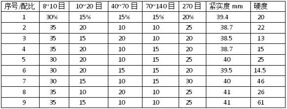 取每一種配比的石英砂300克,混合均勻,倒于抗壓試樣樣筒內(nèi)。然后,在制樣機(jī)上準(zhǔn)確的錘擊5次,記錄緊實(shí)度的大小,取出樣筒,在其底部測量硬度。記錄備考。在所有記錄中選取緊實(shí)度最大者。