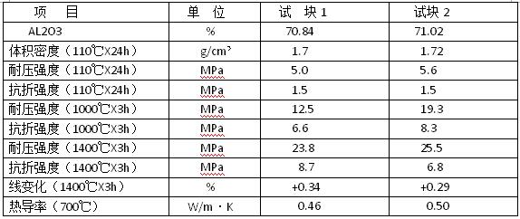 5.1:同一品種的原料體積密度較大的輕骨料,其澆注料有較高的耐壓強度和抗折強度。不同廠家的生產工藝不同。輕骨料本身的強度也有較大的差別,選擇何種原料應該通過檢驗試塊來決定。輕質莫來石澆注料的主要技術指標見表2.