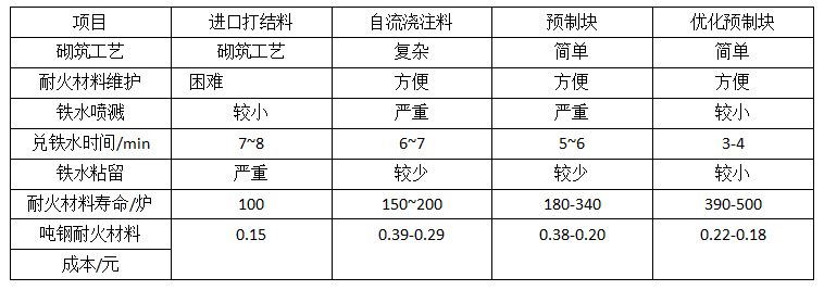 對采取槽種優化措施后制得的兌鐵梢進行了現場使用試驗,結果見表1。通過與其他兌鐵槽的對比發現,優化后的兌鐵檜具有下列優點: