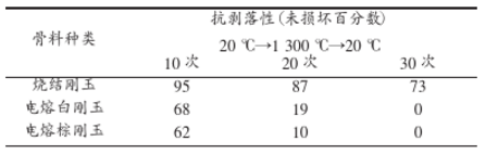 軋鋼加熱爐爐襯澆注料骨料的選擇主要是基于熱震穩定性、高溫性能、導熱性能、成本等方面進行選材。從骨料的熱震穩定性及高溫性能兩個方面分析,骨料應首選電熔莫來石、燒結莫來石、紅柱石等。因為以上幾種原材料在長期使用過程中主晶相是莫來石相,紅柱石骨料在1300℃以上轉變為莫來石相和石英相,石英相可以和基質中的氧化鋁反應生成二次莫來石。另外石英進入液體后,可提高液體的黏度,對提高澆注料的高溫性能起積極的作用。但電熔莫來石、燒結莫來石、紅柱石等骨料的成本相對于高鋁熟料要高,所以骨料中應盡可能少用電熔莫來石、燒結莫來石、紅柱石等材料。電熔白剛玉、電熔棕剛玉、燒結剛玉中骨料應優選燒結剛玉(俗稱板剛玉),因其抗剝落性優于電熔白剛玉和電熔棕剛玉,見表1。但燒結剛玉的成本太高,用于軋鋼加熱爐爐襯澆注料中用戶無法接受;另一方面因燒結剛玉的熱膨脹系數和導熱系數均高于莫來石,過多地使用燒結剛玉作為骨料會降低澆注料的熱震穩定性,增加澆注料的導熱率,不利于節能、環保。