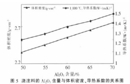 由圖5可知,隨著低水泥澆注料氧化鋁含量的提高,澆注料的體積密度增大,導熱系數提高。由圖6可知,低水泥澆注料的氧化鋁含量在60%左右時,澆注料的荷重軟化開始溫度較高,可選擇在軋鋼加熱爐的高溫段使用,從性價比來考慮,氧化鋁含量在50%的澆注料可選擇在軋鋼加熱爐的低溫段使用,可達到有效的節能目的。