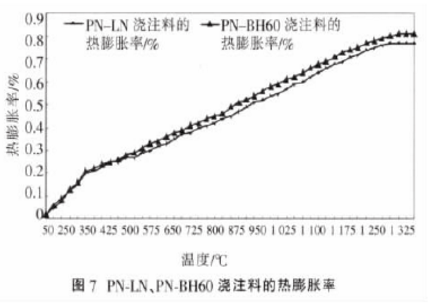 軋鋼加熱爐不定形內襯的膨脹縫數值及分布位置和構造,應由設計規定,膨脹縫數值可按材料線膨脹率大小留。圖7為PN-LN、PN-BH60澆注料熱膨脹率。熱膨脹率檢測標準YB/T 5205-1993,實驗條件為1350 ℃x3 h燒后。由圖7可知,PN-LN澆注料1000℃的熱膨脹率為0.60%,PN-LN低水泥澆注料1000℃燒后的永久線變化率一般為-0.20%,所以軋鋼加熱爐預熱段PN-LN低水泥澆注料的膨脹縫留設為:0.60-0.22=0.40%,即每m應留4 mm的膨脹縫,每2 m左右留8 mm左右的膨脹縫。PN-BH60澆注料1300℃的熱膨脹率為0.81%,由表2、3可知,PN-BH60低水泥澆注料1300℃燒后的永久線變化率為-0.28%,所以軋鋼加熱爐加熱段及均熱段PN-BH60低水泥澆注料的膨脹縫留設為0.81-0.28= 0.53%,即每m應留5.3 mm膨脹縫,每2 m左右留 10.6 mm膨脹縫,但通常膨脹縫。因為在高溫下,材料有液相生成,液相的存在可緩沖材料的膨脹應力,故PN-BH60低水泥澆注料在高溫段一般每2m左右留8 mm的膨脹縫。