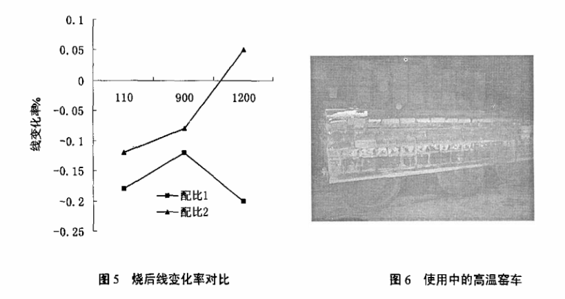 使用溫度下澆注料的燒后線變化率,決定了澆注料使用中收縮裂紋的問題,也是窯車使用壽命高低的重要影響因素之一。通過多孔粘土熟料(配比1)與頁巖陶粒(配比2)的對比試驗發(fā)現(xiàn),用頁巖陶粒配置的澆注料,不但強度高,隔熱保溫性能好的特點,而且燒后收縮小,這是由于頁巖陶粒加熱時有二次微膨脹的緣故。結(jié)果見圖5。