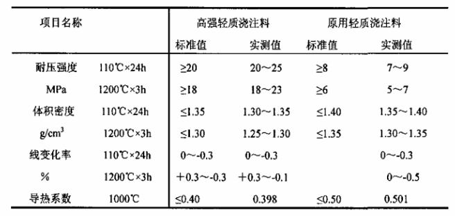 高強輕質(zhì)澆注料理化指標研制的高強輕質(zhì)澆注料理化性能與曾試用過的輕質(zhì)澆注料理化性能進行了對比見表6。