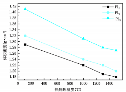 (1)高鋁質(zhì)輕質(zhì)隔熱澆注料的體積密度隨著熱處理溫度的提高呈現(xiàn)減小的變化規(guī)律,并且隨著水泥含量的增加,體積密度增大。