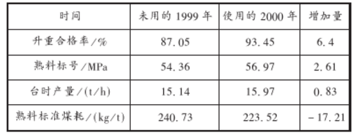 由于平時產量的提高,2000年較1999年多產熟料6544t,創經濟效益19.6萬元;由于煤耗的下降,2000年較1999年節煤1809t,創經濟效益41.6萬元。兩項合計共創經濟效益61.2萬元。