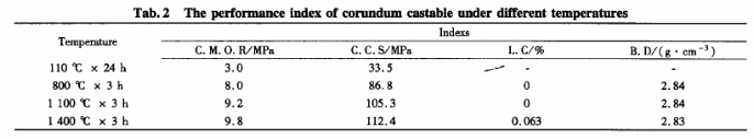按一定的質(zhì)量比稱取各相應(yīng)的原料放入攪拌鍋中均勻,并分別添加適量的復(fù)合添加劑和結(jié)合劑。經(jīng)試驗測定該材料的流動速度為107.8%(跳桌法),能較好的滿足材料的施工性能要求。同時通過對材料現(xiàn)場澆注過程的分析,我們采用相應(yīng)的模擬試驗,把攪拌好的料直接放入一定溫度的40mm×40mm×160mm模具內(nèi)振動成型,把成型好的試樣及其模具一起放入烘箱進行60℃×3h的烘烤后脫模,此階段相當于材料的澆注施工中,因為不斷鋪料時,材料中含自由水分的揮發(fā),有效的降低了材料施工環(huán)境的溫度,而材料在施工完成后,水分逐漸排出,溫度開始升高,因此我們烘烤2個小時直接進行110℃烘烤,經(jīng)過約2h烘烤后,材料內(nèi)部自由水分基本完全排出(通過對試樣在110℃經(jīng)2h、4h、6h烘烤后,測得試樣的質(zhì)量在2h后變化不大,4h基本無變化),其后就對試樣分別進行815、1100和1400℃保溫3h的熱處理,相當于高爐修補后的復(fù)風。其理化指標見表2。