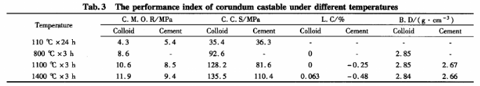 按上面相同的質(zhì)量比分別采用溶膠和水泥結(jié)合攪拌均勻的材料,放入尺寸分別為40mm×40mm×160mm和70mm×70mm×70mm常溫模具內(nèi)澆注成型,自然固化后脫模,對試樣進行110℃×24h的干燥,然后將該試樣于高溫成型的試樣一起分別進行815、1100和1400℃保溫3h的熱處理。其理化指標見表3。