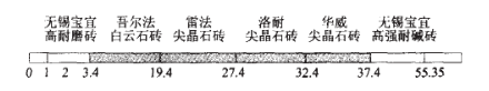 原配磚方案見圖1,窯口2~3.4m及過渡帶19.4~27.4m、27.4~37.4耐火磚使用壽命分別見表1~表3。