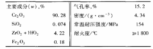 由于耐火磚中Cr2O3含量對抗熔渣的蝕損性非常關鍵,因而一般耐火磚型號均以Cr2O3的含量多少命名,煤氣化爐耐火磚的主要成分質量組成及理化性能指標如表1。
