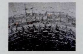 氣化爐緊急停車或發生操作故障時,爐溫急劇變化,也是向火面磚產生裂紋的主要原因,這可能導致由于熱應力而引起向火面磚出現大面積剝落,厚度可達5~30mm不等(見圖4)。隨著裂紋的產生和爐渣的滲透,在耐火材料表面形成滲透層,由于滲透層在膨脹系數等諸多理化性能與原耐火材料存在差異,在渣滲透帶和未滲透層之間也形成應力,隨著溫度的變化,會出現整體剝落。