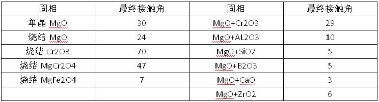 Cr2O3可降低熔渣對(duì)耐火材料的潤(rùn)濕性。如表1.2所示,熔體(其成分包含SiO2 61.5%、AL2O3 17.8% 和 MgO 20.7%)在Cr2O3、MgCr2O4、MgO以及含有3%其他氧化物的MgO的耐火材料試樣上在1370℃保持2h后的接觸角,表明熔渣在Cr2O3以及含有鉻材料上的接觸角大,熔渣對(duì)含鉻材料的潤(rùn)濕性差。