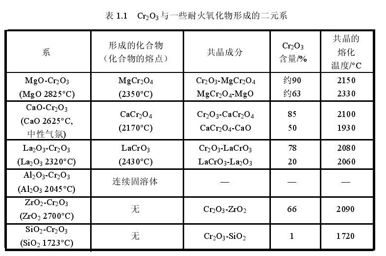 高溫下Cr2O3在與一些主要耐火氧化物形成的二元系中,它們所形成的化合物熔點(diǎn)較高以及形成的低共熔點(diǎn)溫度高,所以Cr2O3稱為耐火材料的重要原料和添加劑。