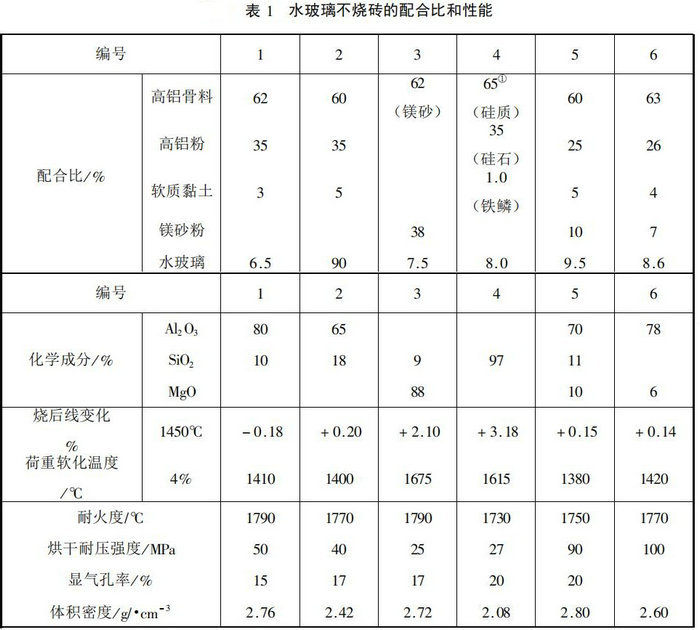 水玻璃不燒磚的使用部位不同,其配合比和性能也不同。現將歸納后的水玻璃不燒磚配合比和性能,列于表1。編號1~3的耐火骨料臨界粒徑分別為6mm,8mm種 10mm,其余的為5mm;水玻璃模數為2.4~3.0,密度為1.38~1.50g/cm³在壓磚機上成型后,進行烘干,溫度約為100℃,干燥時間不少于48h。回轉窯窯襯磚,有時烘至600℃。烘干的不燒磚,其含水率小于1%。
