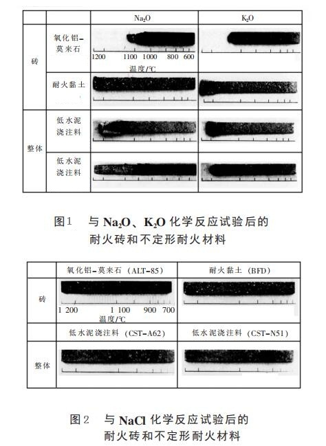 高鋁磚及黏土質耐火材料與堿性金屬鹽Na2CO3、K2CO3和NaCl 做了反應試驗,得出以下結論: