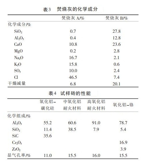 試驗使用的焚燒灰的化學成分示于表3。試驗使用的耐火磚品質示于表4。這次試驗所選擇的是應用于工業焚燒灰熔融爐的耐火磚。為了快速反應,加熱條件是在1300℃保持2h。