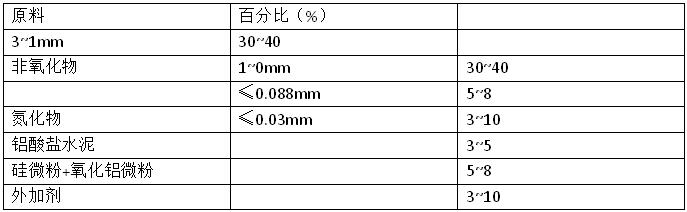 根據最緊密堆積原理和生產實踐經驗,并考慮到生產的方便性及工業篩制的標準,我們骨料顆粒選擇3~1mm、1~0mm 二級級配,將粒度為≤ 0.088mm的非氧化物細粉、硅微粉、鋁酸鹽水泥、氮化物細粉和外加劑預混均勻,然后加入 3~1、1~0mm 碳化硅骨料混合均勻 , 再加入 5% 的水攪拌均勻后按試驗方法的制樣和檢測標準進行制樣檢測,根據試驗結果進行配方優選,得到了最佳配方見下表。