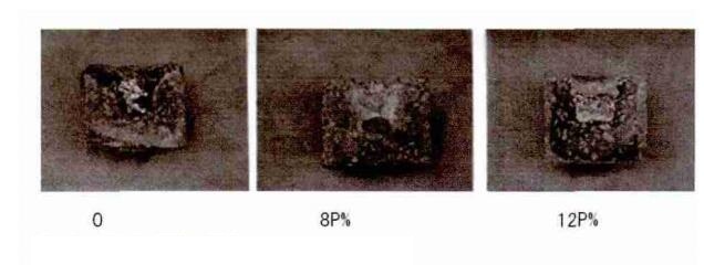 由圖1可知,隨著氮化物細粉含量的逐漸增大,抗折強度和耐壓強度也逐漸提高,這是因為加入氮化物細粉后,它與SiO2 微粉在高溫下形成Si 2N2O部分膠結相,從而提高了澆注料的強度。同時為了清楚氮化物細粉加入量對抗渣性能及抗氧化性能的影響,又分別將加入0、8P%、12P%氮化硅物粉的復合材料分別制成坩堝,加入金屬銅,埋炭 1250℃ ×3h 燒成,燒后切開看其剖面的滲透情況見圖2: