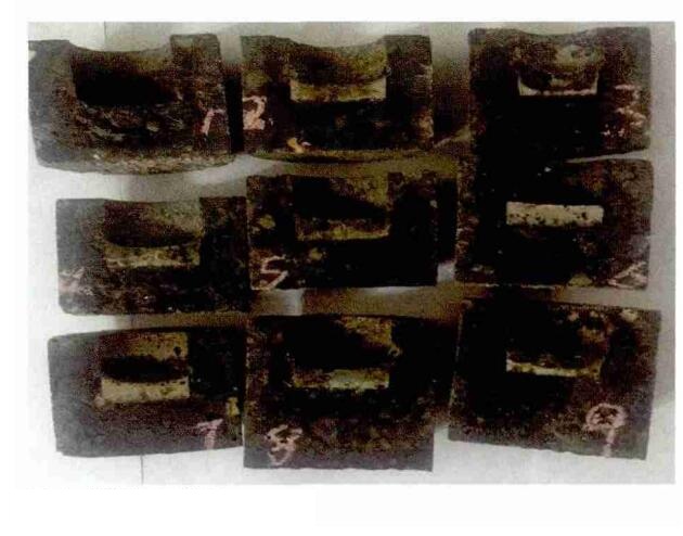 碳化硅等非氧化物材質具有較好的抗金屬熔液滲透的性能,但由于鋁酸鹽水泥和其它成份的加入是否影響抗金屬熔液滲透的性能,針對該問題我們對該耐火材料也進行了抗金屬熔液滲透試驗,我們選用陽極銅為實驗用金屬銅材料我們選擇氮化物為 0、8P%、12P%和結合劑鋁酸鹽水泥為0、1a%、2a%、固定骨料、硅微粉、氧化鋁微粉進行正交配方組合試驗實驗 采用靜態坩堝法,坩堝內裝金屬和渣混合物30 克,并將坩堝上口用碳化硅薄片磚蓋上并用碳化硅膠泥密封,然后在高溫重燒爐1350℃加熱72小時,然后將坩堝沿中線切開,觀察金屬液和渣的滲透侵蝕情況,圖4為坩堝切開狀況,當氮化物為0,鋁酸鹽水泥為0時,金屬 液和渣全部滲透,隨著鋁酸鹽水泥和氮化硅的增加,抗金屬液和渣的滲透侵蝕變好,但當鋁酸鹽水泥和氮化物為最大量時(9#),反而變差從圖4中可以看出6#和7# 最好,6# 氮化物加入量為8P% 和水泥加入量為0%,7# 氮化物加入量為8P% 和鋁酸鹽水泥加入量為 2a%。