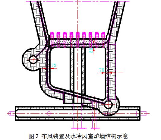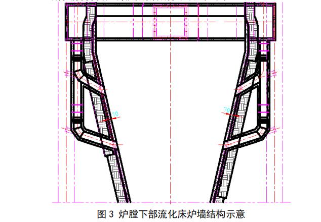 布風裝置及水冷風室內部點火時溫度 900℃左右,正常運行在150℃左右,不存在磨損現象,但溫度變化大,熱沖擊劇烈。對耐火材料要求有較高的抗熱震穩定性,不應輕易 發生脫落現象。耐火層材料應采用磷酸鹽耐火混凝土如圖2