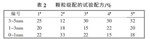 澆注料的致密程度和流動性跟顆粒級配密切相關(guān),而最佳的顆粒級配又隨骨料種類、臨界粒度的大小和基質(zhì)組成的不同而不同,最合適的顆粒級配應(yīng)該由試驗確定。本試驗選擇了5 種不同的顆粒級配,細粉部分全部相同,顆粒級配的試驗配方如表2所示。