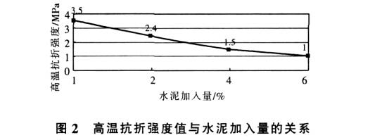 首先選擇兩組水泥加入量,一組加 4%,一組加5%,各組中的uf-SiO2和α-Al2O3有所調(diào)整。試驗結(jié)果顯示,所有配方的常溫耐壓強度都大于80MPa, 但1 500℃下保溫0.5h的高溫抗折強度均小于1MPa,這說明水泥的加入量太大。為了驗證水泥對高溫抗折強度的確切影響,又進行了一組試驗。試驗方案為:將水泥量從1%逐漸增大到6%,α-Al2O3 固定不變,碳化硅的加入量固定為16%, uf-SiO2的量隨水泥量而調(diào)整以保持基質(zhì)總量不變。試驗結(jié)果如圖2所示。
