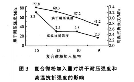 本澆注料屬于低水泥系列,難點在于既要在1500℃保溫0.5h 后獲得較高的高溫抗折強度值,又要具有較高的烘干耐壓強度。因為烘干耐壓強度主要來源于水泥的水化,為了得到較高的烘干耐壓強度,勢必要加入較多的水泥,而較多的水泥又會使高溫下的液相量增加,使高溫抗折強度下降, 前期的試驗工作已經(jīng)證實了這一點。為了解決這個矛盾,必須在優(yōu)化基質(zhì)上下功夫,也就是 uf-SiO2 和 α-Al2O3 復(fù)合微粉的加入量要進行嚴格的控制,既要發(fā)揮uf-SiO2的結(jié)合作用來增加強度,又要控制高溫下的液相量使高溫抗折強度達標。 本試驗將水泥的加入量定為2%,考察復(fù)合微粉的加入量對常溫耐壓強度和高溫抗折強度的影響, 試驗結(jié)果示于圖3