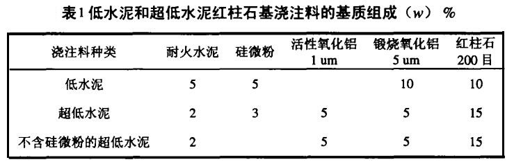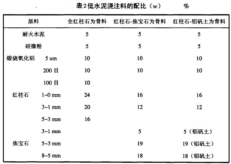 表2示出了不同低水泥骨料澆注料的配比:(1)以全紅柱石為骨料的低水泥澆注料,可用于 對熱穩定性,抗熱震性和低蠕變性要求很高的設備中。如中間包,鋼水包和鐵水包的永久襯等。(2)紅柱石骨料的50%換成焦寶石。焦寶石是莫來石和方石英的混合物,它的各項性能均低于紅柱石。與全紅柱石澆注料相比,這種澆注料的性能稍有下降,但成本減少很多。(3)把全紅柱石澆注料骨料中的中大顆粒換成鋁礬土。鋁礬土的基本組成是燒結剛玉有很強的抗機械磨損性能。這種澆注料除紅柱石帶來的熱穩定性,抗熱震性和低蠕變性外,鋁礬土的加入帶來了抗機械磨損性能?捎糜阡撍F水包和高爐的鐵水溝工作襯。
