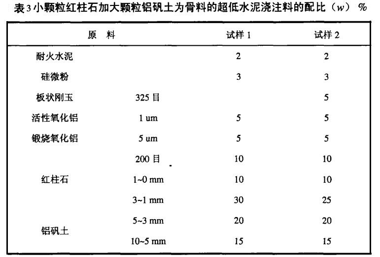 表3是小顆粒紅柱石加大顆粒鋁礬土為骨料的超低水泥澆注料。試樣1的抗機械磨損和化學侵蝕性能都比上列低水泥紅柱石鋁礬土澆注料強。用于鋼水包鐵水包的整體澆注和高爐鐵溝和搖擺槽。試樣2中加入了板狀剛玉以增強高溫下各項指標