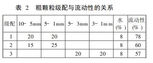 在級配:>1mm40% , 1~0mm20%、<0. 088mm40%的情況下,骨料中粗細配比對流動性的影響見表2。 從表2中可以看出,粗粒量大則流動性好,有人說把臨界粒度控制在5mm以下,實驗表明,結論正相反。從理論上說,>1mm組分中顆粒越大,則比表面越小,與泥漿的接觸面積也越小,流動阻力小,則流動性好。