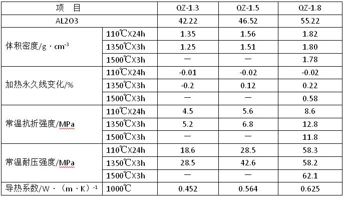 傳統(tǒng)輕質(zhì)澆注料的原料配制主要采用輕質(zhì)骨料與重質(zhì)細(xì)粉,所用輕質(zhì)骨料的氣孔直徑較大且強(qiáng)度較低,因此輕質(zhì)澆注料的導(dǎo)熱系數(shù)較高,同時(shí)因骨料強(qiáng)度低而影響輕質(zhì)澆注料的整體強(qiáng)度,限制了其在更高溫度下的使用。因此將拋棄傳統(tǒng)的生產(chǎn)工藝此次采用微孔骨料和高強(qiáng)骨料。所用原料主要有微孔輕質(zhì)莫來(lái)石、空心球、高鋁礬土、漂珠、藍(lán)晶石、二氧化硅微粉、氧化鋁微粉、純鋁酸鈣水泥、生礬土粉、紅柱石等,各種原料按比例稱(chēng)量,加入攪拌機(jī)中先干混2min,后加水?dāng)嚢杈鶆颍駝?dòng)澆筑成40mmX40mmX160mm的條形試樣,養(yǎng)護(hù)24h脫模,經(jīng)110℃X24h烘干,1350℃X3h燒后按有關(guān)標(biāo)準(zhǔn)檢測(cè)其體積密度、常溫耐壓強(qiáng)度、高溫抗折強(qiáng)度、加熱永久線(xiàn)變化、導(dǎo)熱系數(shù)等指標(biāo)。