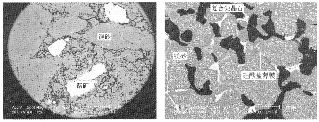 從圖3-2中可以明顯看出,直接結合鎂鉻磚基質中的主晶相仍為粒狀方鎂石,其晶內亦包含有大量的尖晶石脫溶相(方鎂石晶粒內的白色析出物)其次有少量的復合尖晶石(白色)和灰白色薄膜狀硅酸鹽相填充于方鎂石晶間。主晶相方鎂石主要通過方鎂石-方鎂石、方鎂石-鉻礦(復合尖晶石)結合在一起,即晶粒間以直接結合為主;另一部分則通過少量的硅酸鹽相薄膜膠結在一起。直接結合的顯微結構特點顯著提高了該種鎂鉻磚的高溫性能、抗侵蝕與抗沖刷,使其成為目前應用較普遍的一種鎂鉻磚。直接結合鎂鉻磚在有色冶煉爐、水泥窯等使用條件苛刻的部位均得到了廣泛應用。