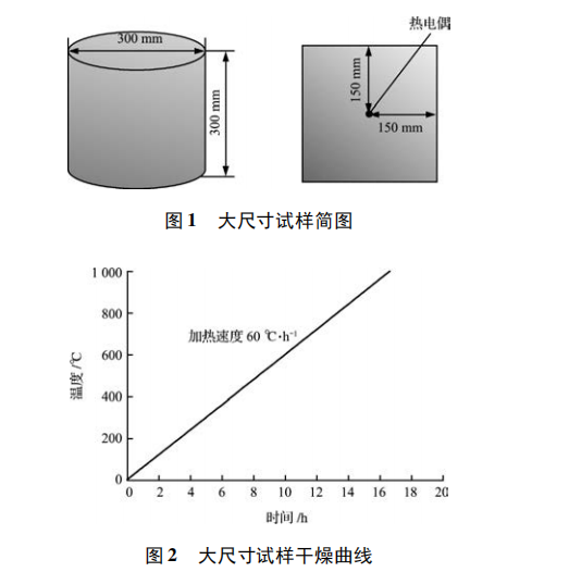 試樣的簡圖示于圖 1。 1 所示試樣的尺寸是Φ300 mm × 300 mm熱電偶置于150 mm × 150 mm中心位置,混煉好的澆注料進行澆注,養生 24 h。如圖2所示,脫模后以 60 ℃ / h 的速度加熱到1 000 ℃。根據所獲得的試樣內部溫度曲線對干燥特性進行了評價