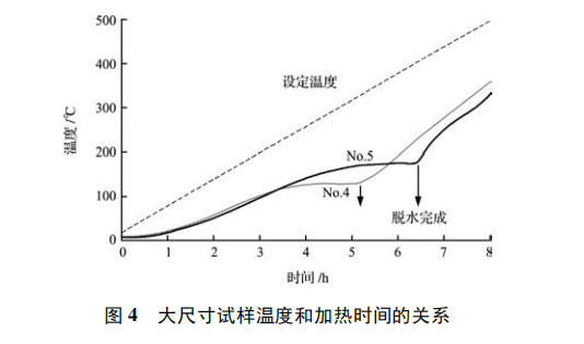 No.5 試樣透氣率有所提高,為了比較,對 No.4試樣進行了干燥試驗所獲得的試樣內部溫度曲線示于圖 4。對應設定溫度,No.4 試樣和 No.5 試樣幾乎都是按照相同的速度持續升溫,但是 No.4 試樣在 130 ℃附近升溫速度放緩,推測最大蒸汽壓力大約是0.3 MPa。 No.5 試樣是在180 ℃放緩,推測蒸汽壓力大約是 1.0 MPa。另外從拐點位置算起,No.4 試樣的脫水完成時間比 No.5 試樣快 1.3 h 左右。由圖可知,No.4 試樣尺寸大、透氣率高、內部蒸汽壓力沒有提高,干燥結束時間也早。
