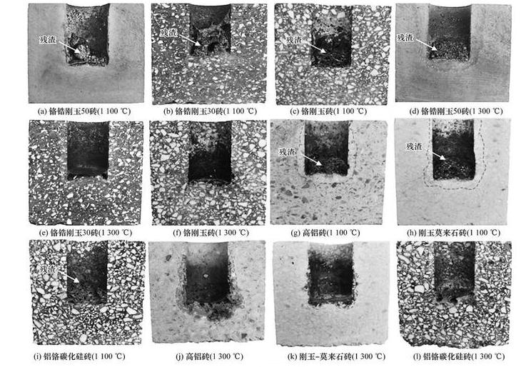 結論;(1)在1100℃侵蝕試驗后,6組試樣均表現出較好的抗侵蝕性能和抗滲透性能,試驗后坩堝內都殘留了大量熔渣。