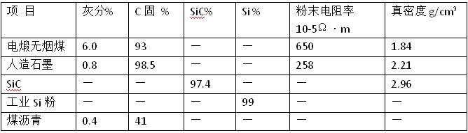 原料選用經1750-2000℃的電煅燒無煙煤此時已經半石墨化,石墨化呈度達15%30%,它的結構致密、強度高。因此,以其作為主要原料。為提高導熱系數、耐堿性,改善成型性,加入少量人造石墨。另外加入SiC,原因在于SiC比碳優先氧化生成SiO。保護膜,覆蓋于表面,阻止制品進一步氧化,可提高炭制品的抗氧化性。為提高材料的質量,加入少量工業硅微粉,在焙燒成過程中,工業硅微粉與碳發生了Sis+Cs)→β-SiCs)反應 ,生成物β-SiC,可賦予制品較高強度和耐磨性少量氣孔壁上未反應的Si與氣孔中的氧、氮發生4Si(s)+ 2N2 (g)+ O2 (g)2Si2ON2 (s)反應 Si2ON2 為針狀結晶,使氣孔變細或封閉、堵塞氣孔,降低制品透氣度,阻止渣、鐵的滲透,提高耐氧化性。各種原料的理化性能見表1