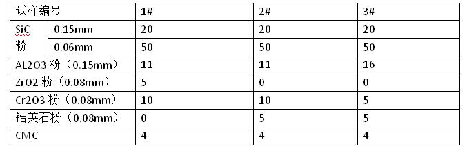 試驗(yàn)碳化硅耐火材料則以SiC粉(工業(yè)純度SiC≥97%),AL2O3粉(工業(yè)純度AL2O3≥98%)為主要原料,并分別添加鋯英石粉(工業(yè)純度ZrO2≥65%)、ZrO2粉、Cr2O3、一級(jí)羥甲基纖維素(CMC)做結(jié)合劑配制成3種不同含量的成品料,配料成分表如下。